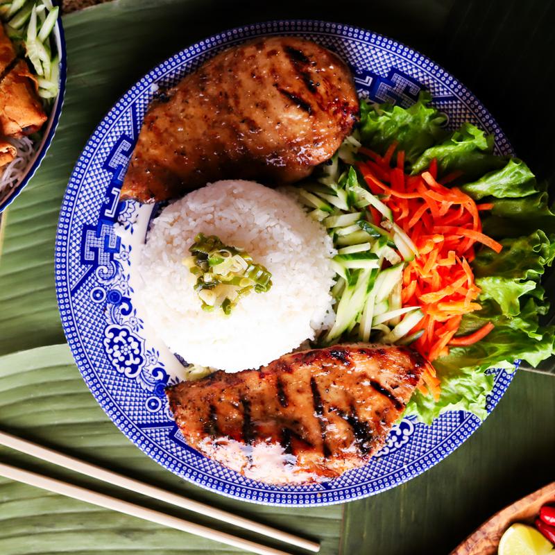 Vermicelli with spring rolls, grilled pork, grilled lemongrass chicken & grilled satay beef.